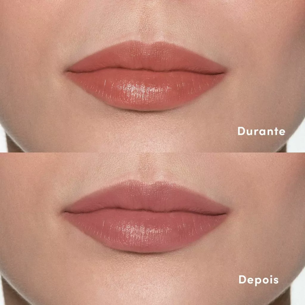 E o melhor, o batom é 3 em 1, ou seja, quando aplicado apenas uma camada seu acabamento é de balm, na segunda camada ele se transforma em efeito batom, mais pigmentado, sabe?