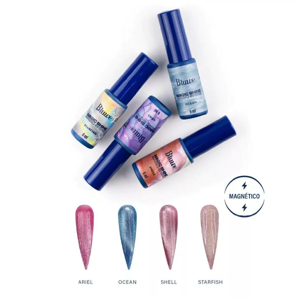 Ariel e Ocean tem efeito magnético moderado. Shell tem efeito magnético intenso. Starfish é o diferentão, sua mágica está na variação de partículas de brilho multicoloridos que se destacam com seu efeito magnético suave.